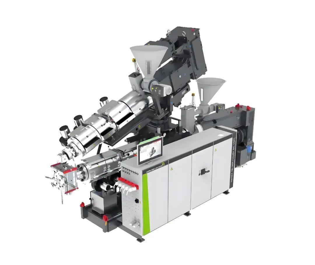 该解决方案将锥形双螺杆挤出机conEX NG 65安装在平行双螺杆挤出机twinEX 78的顶部,允许同时处理原生PVC材料、再生材料和改性化合物,并始终保持高品质。通过模块化系统,节约生产空间,满足紧凑型生产制造需求。