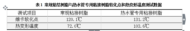 1) 热水管专用粘接树脂在耐热性上与常规粘接树脂相比具有明显优势,软化点、热变形温度、高温剥离强度等指标提升明显,制备的成品管界面粘接效果优异。
