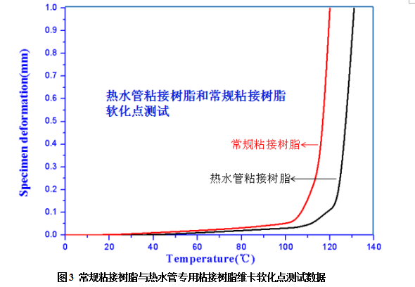 从测试数据可以看出,热水管专用粘接树脂软化点及热变形温度均比常规粘接树脂有明显提高。粘接树脂耐温性提高能够保证静液压强度试验中高温高压条件下粘接界面的稳定性。软化点和热变形温度测试原始数据见图3和图4所示。