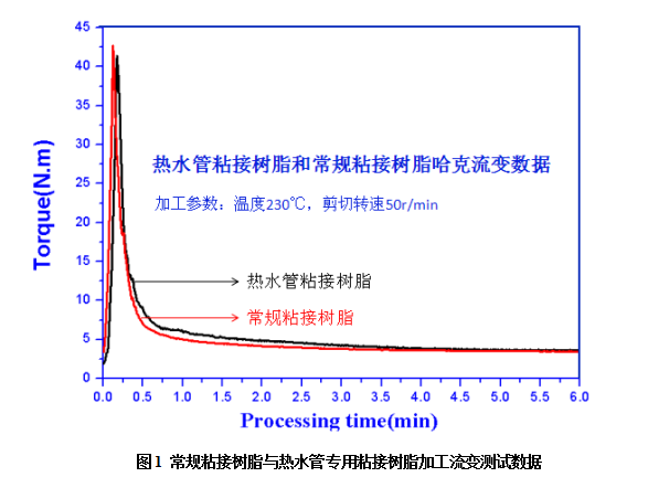 从流变数据中可知,热水管专用粘接树脂和常规粘接树脂塑化性能及平衡扭矩非常相似,加工性能非常接近。