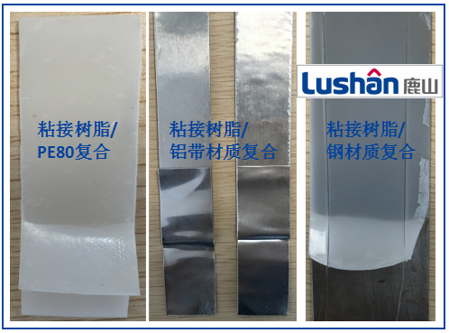 实验室分别测试热水管专用粘接树脂与聚乙烯管材料、钢材质、铝材质等不同材质的剥离强度,并与常规粘接树脂进行对比,复合好的剥离强度测试样品见下图所示,测试的剥离强度数据见下表。