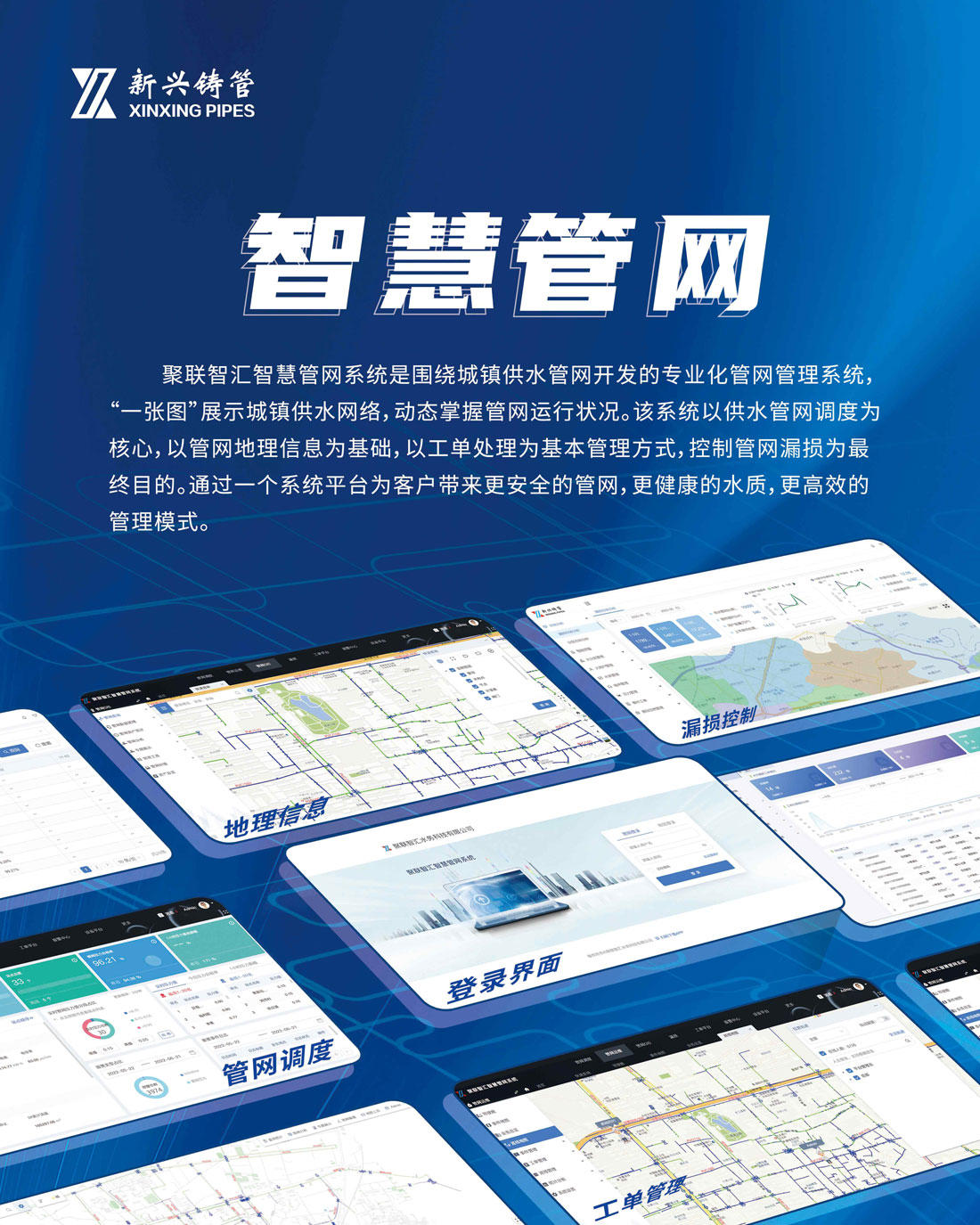 新兴铸管旗下的全资子公司聚联智汇水务科技有限公司研发的“聚联智汇智慧管网系统”得到了客户的关注,该系统以管网调度为核心,以管网地理信息为基础,以工单处理为基本管理方式,可“一张图”展示城镇水务网络,动态掌握管网运行情况,便捷处理运维工单。旨在给客户带来更安全的管网,更健康的水质,更高效的管理模式, 为客户提供实时管网监测系统和一站式协同服务。