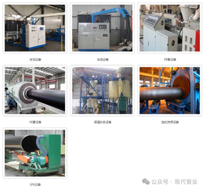 公司主要生产设备为5条可生产Φ90—Φ1680聚乙烯外护管真空定经大型自动生产线,6台大型无支架高压发泡机及平台流水生产线、3PE管道防腐全自动生产线、给水用聚乙烯PE管材生产线、电缆穿线管生产线、各种型号外架空保温管模具、外墙保温砂浆,聚氨酯板材等生产线。