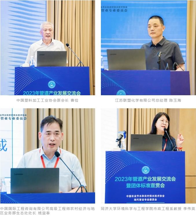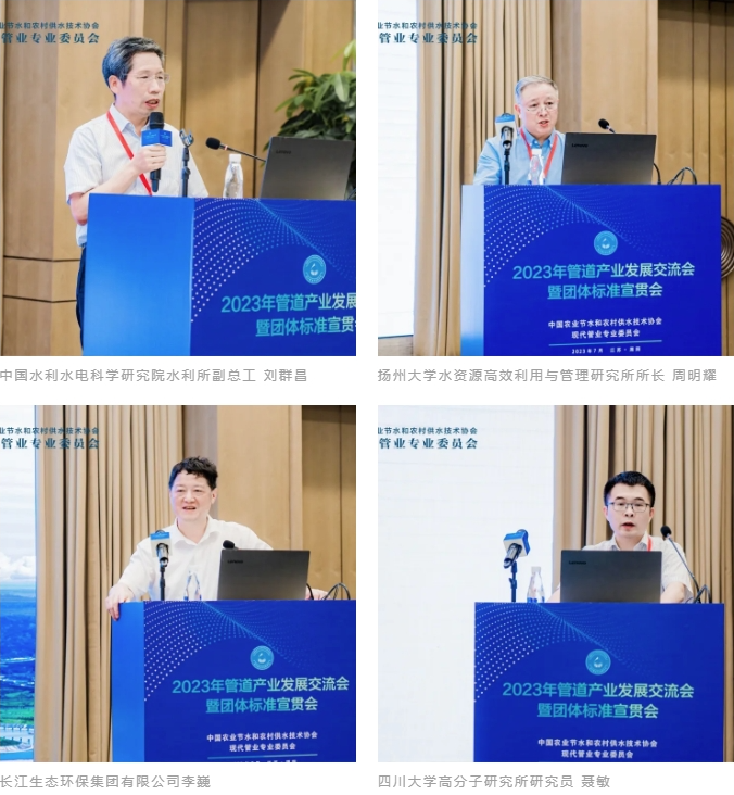 中国塑料加工工业协会原会长曹俭、江苏联盟化学有限公司陈玉海总经理先后致辞;中国国际工程咨询有限公司高级工程师农村经济与地区业务部生态处处长钱益春、中国水利水电科学研究院水利所副总工刘群昌、扬州大学水资源高效利用与管理研究所所长周明耀、同济大学环境科学与工程学院市政工程系教授李伟英、长江生态环保集团有限公司李巍总、四川大学高分子研究所研究员聂敏、中化学土木工程有限公司环境工程分公司党委书记黄磊、中建六局水利水电北分司经理钱丹、中国国检测试控股集团有限公司管道与节水产品检验认证室主任孙飞龙等15位在各自领域的知名专家做了专题报告.会议开幕式由中国农业节水和农村供水技术协会现代管业专委会秘书长周川主持,专题报告分别由日丰新材有限公司谭美经理、宁夏青龙塑料管材有限公司研发总工李永峰主持。