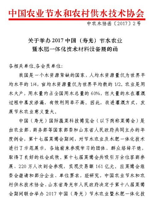关于举办2017年中国(寿光)节水农业暨水肥一体化技术材料设备展的函