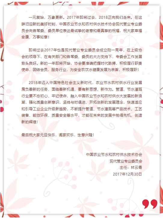 一元复始,万象更新。2017年即将过去,2018正向我们走来。在这辞旧迎新的美好时刻,中国农业节水和农村供水技术协会现代管业专业委员会向各常委、委员单位表达最诚挚的谢意和最真挚的祝福,祝大家新年万象更新、事事顺心、阖家欢乐!