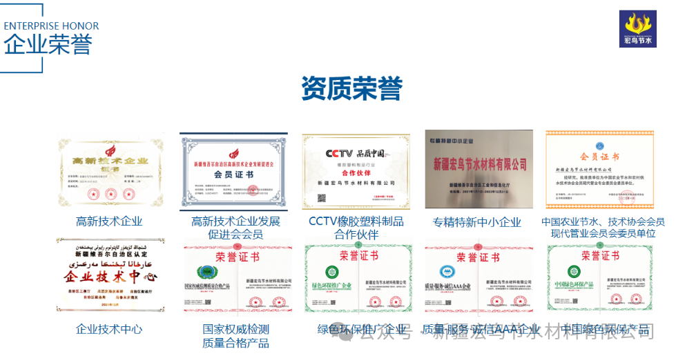 我公司生产的农业节水灌溉系列产品于2018年入选为《中国绿色环保产品》;2018年在全国绿色环保宣传推广活动中,入选为《绿色环保推广企业》;2018年在产品质量、售后服务及企业诚信度入选推广活动中入选为《质量、服务、诚信AAA企业》;2018年我公司生产的农业节水灌溉系列产品入选为《国家权威检测质量合格产品》。2018年我公司从小规模企业升为规上企业;2020年被评定为“高新技术企业”;2021年被评为“专精特新企业”目前在复审阶段;2023年新疆橡胶管业中首位受邀参加“CCTV品质中国”节目,被选入橡胶塑料制品行业合作伙伴;2024年被自治区工信厅评为“绿色工厂”公司现有实用新型专利17项,研发型专利4项,正在申报的发明型专利2项.