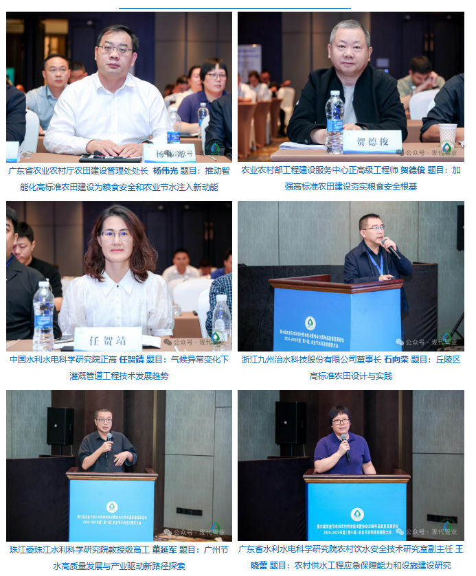 交流会上,来自广东省农业农村厅农田建设管理处处长杨伟光、农业农村部工程建设服务中心正高级工程师贺德俊、中国水利水电科学研究院正高任贺靖、浙江九州治水科技股份有限公司董事长石向荣、珠江委珠江水利科学研究院教授级高工董延军、广东省水利水电科学研究院农村饮水安全技术研究室副主任王晓蕾、中国农业大学水利与土木工程学院教授杨培岭、 上海熊猫机械(集团)有限公司战略发展部总监许晓娟、上海威派格智慧水务股份有限公司解决方案总监陈晗、河南盛鼎建设集团有限公司副总经理朱会彬等10位农业水利领域的专家,就工程建设管业发展专题报告,聚焦“实战+前沿”,亮点密集,共覆盖10项核心议题,从工程建设,施工技术、产业标准,等维度全面解码节水供水高质量发展路径。