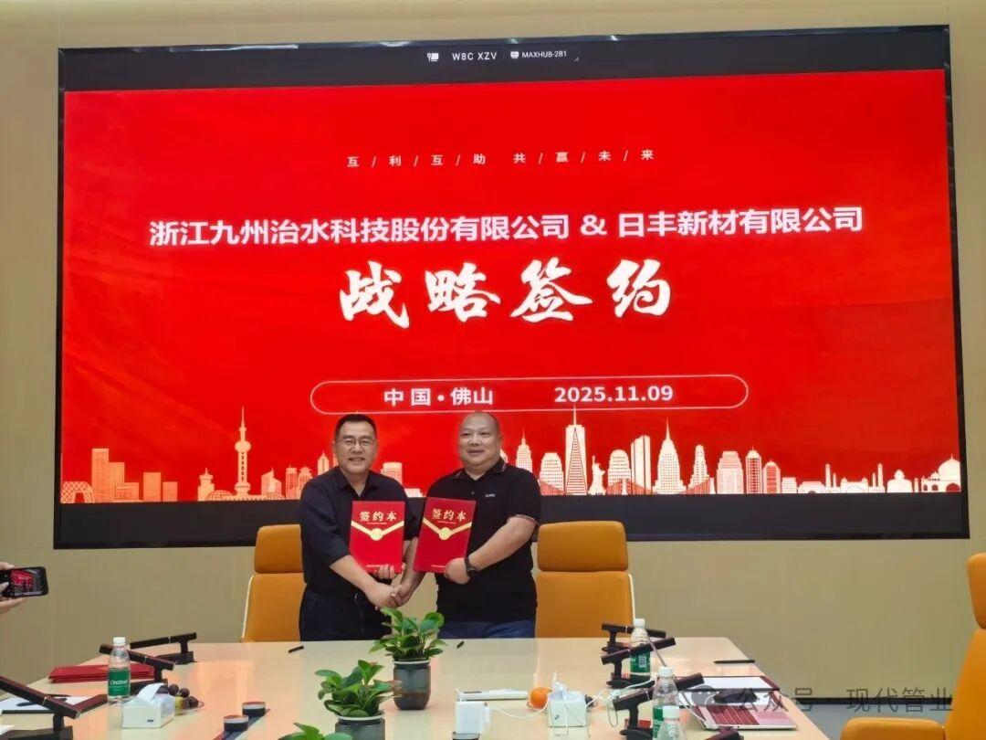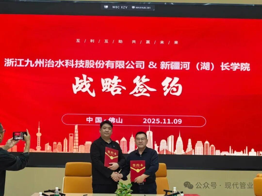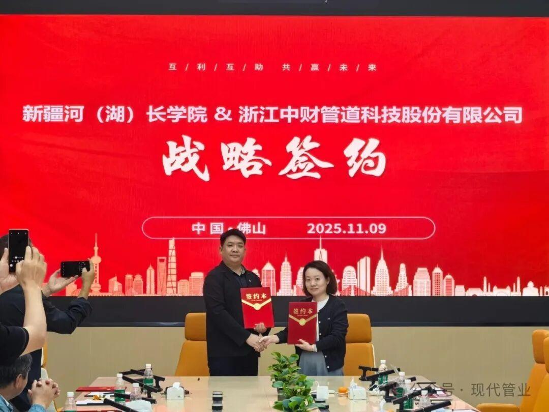 最后,在日丰新材有限公司举行战略合作签约仪式,浙江九州治水科技股份有限公司 & 新疆河(湖)长学院、浙江九州治水科技股份有限公司 & 日丰新材有限公司、新疆河(湖)长学院 & 浙江中财管道科技股份有限公司依次签署战略合作协议。聚焦水资源管理、水利行业人才培养、提升高标准农田建设等领域开启深度合作。此次签约不仅实现了合作各方的优势互补与资源共享,更将加速前沿技术成果的产业化落地,推动行业技术迭代与产业升级。将充分发挥各自在技术、资源、市场等方面的核心优势,构建“研发-生产-市场”全链条合作模式。