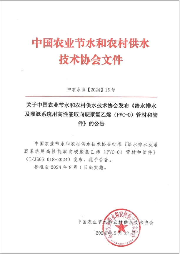 中国农业节水和农村供水技术协会批准《给水排水及灌溉系统用高性能取向硬聚氯乙烯(PVC-O)管材和管件》(T/JSGS 018-2024)发布,现予公告。标准自2024年8月1日起实施。
