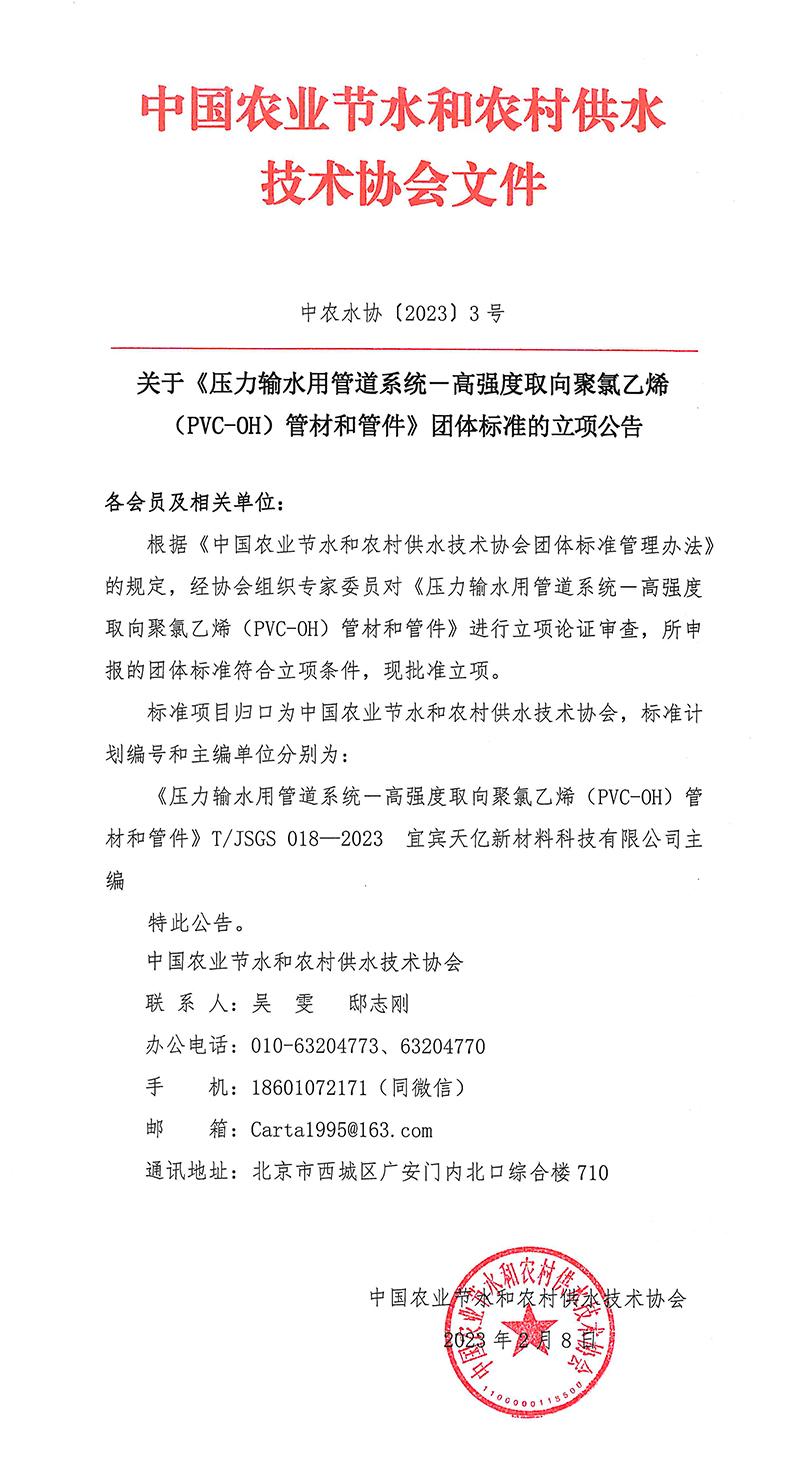 根据《中国农业节水和农村供水技术协会团体标准管理办法》的规定,经协会组织专家委员对《压力输水用管道系统一高强度取向聚氯乙烯 (PVC-OH) 管材和管件》进行立项论证审查,所申报的团体标准符合立项条件,现批准立项。