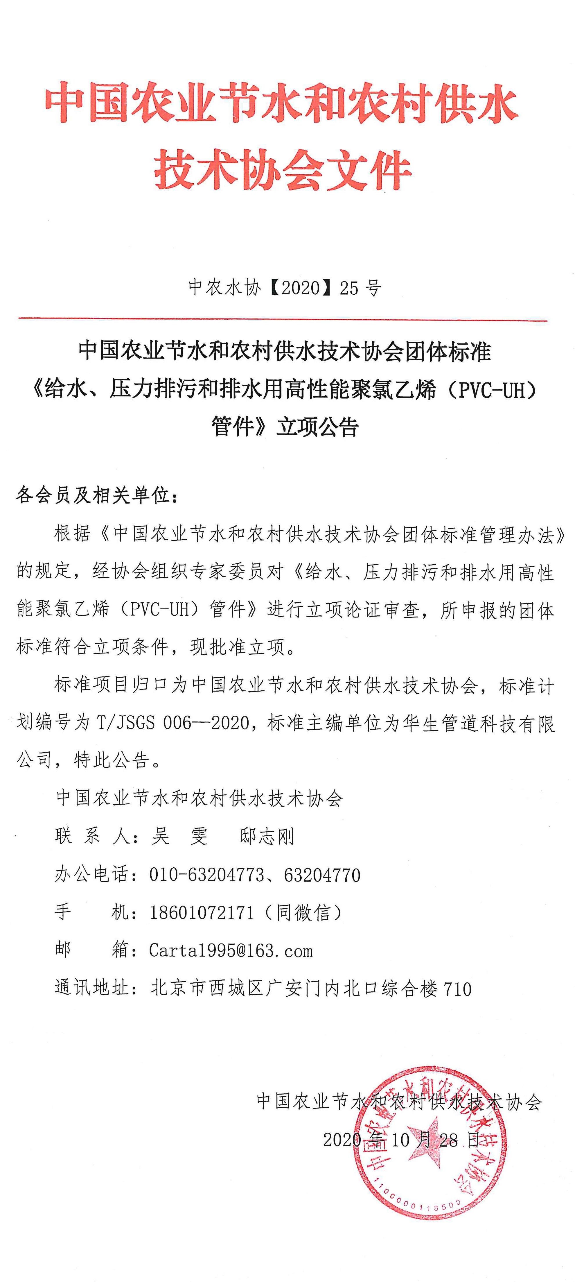 中国农业节水和农村供水技术协会团体标准《给水、压力排污和排水高性能聚氯乙烯(PVC-UH)管件》立项公告
