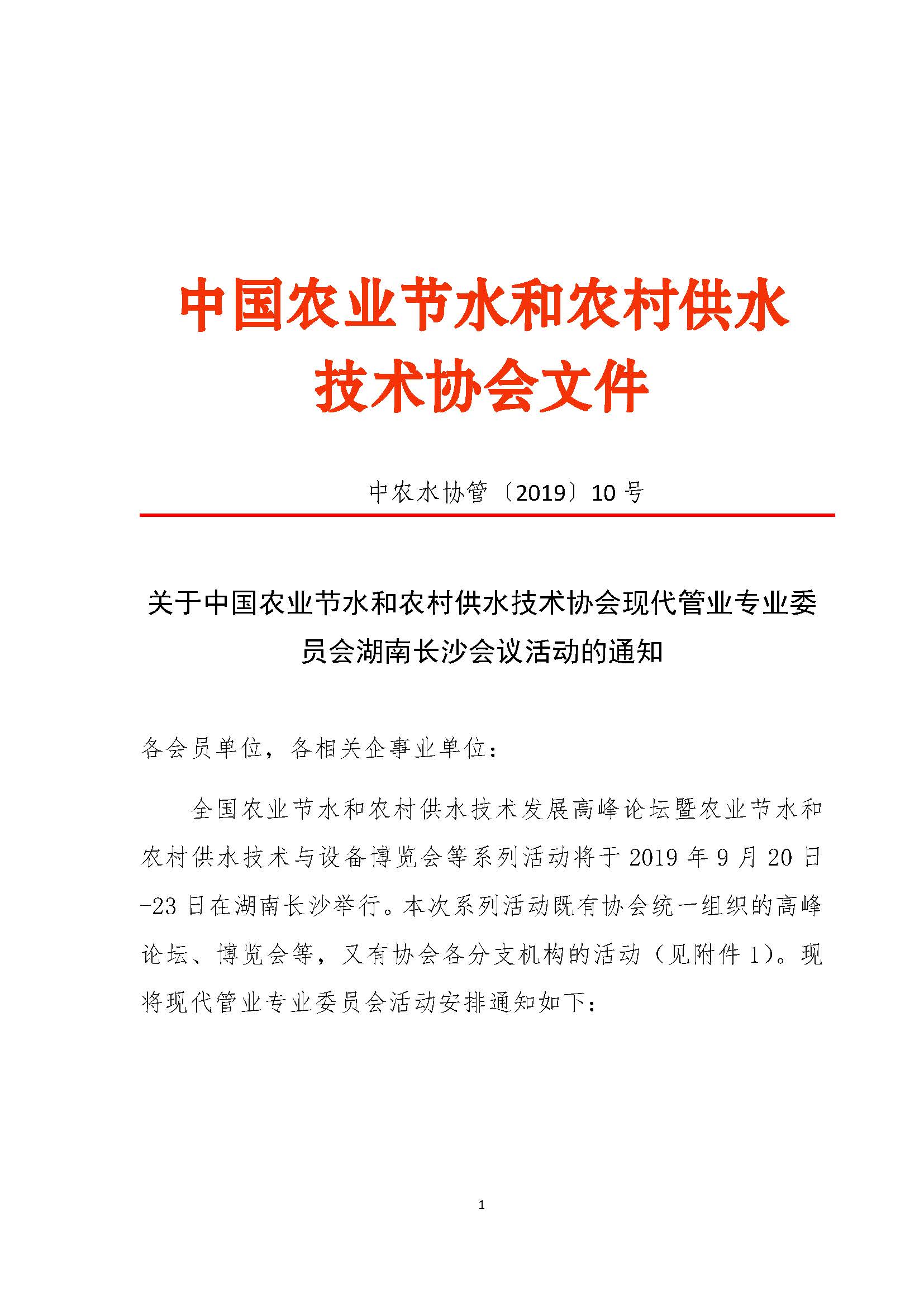 关于中国农业节水和农村供水技术协会现代管业专业委员会湖南长沙会议活动的通知