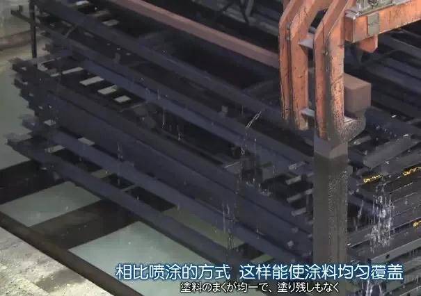 涂装汽车框架方法一致到电池涂装,房屋框架使用长达6米的钢架制成,用巨大的切割器处理成相应的尺寸,用电钻开孔,把处理过的钢架浸入巨大的水池中,这个工序称为电泳涂装,和涂装汽车框架的方法一致,这样处理方式能够防止生锈。