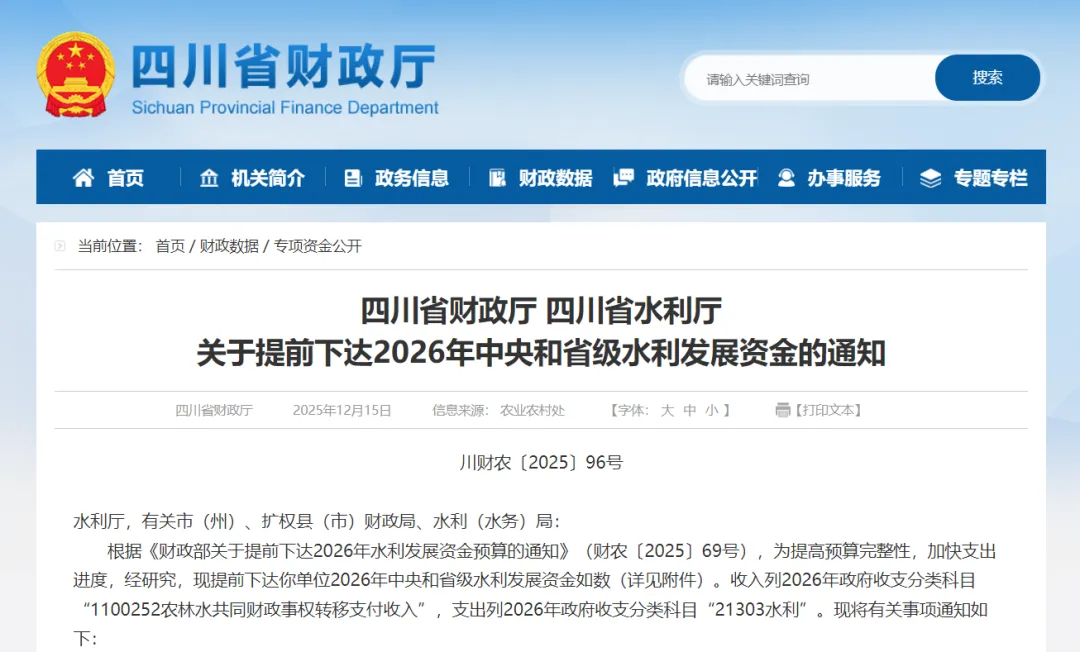 近日,四川省2026年中央和省级水利发展资金,总额达29.7亿元提前下达至各地,为全省水利工程建设注入强劲动力。
