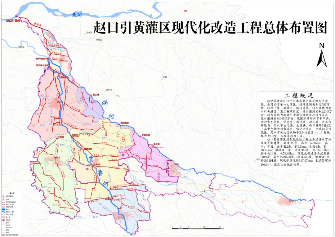 赵口引黄灌区始建于1970年,设计灌溉面积587万亩,是全国第四、河南省第一大灌区,覆盖郑州、开封、许昌、周口、商丘5市的14个县(区)。灌区以总干渠~运粮河~涡河为界,东侧为赵口引黄灌区二期工程,2025年12月28日通过竣工验收;西侧为赵口引黄灌区现代化改造项目区。