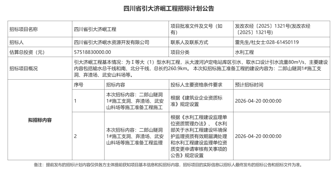 本次招标的施工准备工程(第一批)包括施工与监理两个标段。施工标段涵盖二郎山隧洞1号施工支洞、弃渣场、武安山料场等关键施工内容。监理标段同步进行,招标范围为施工全过程监理服务。