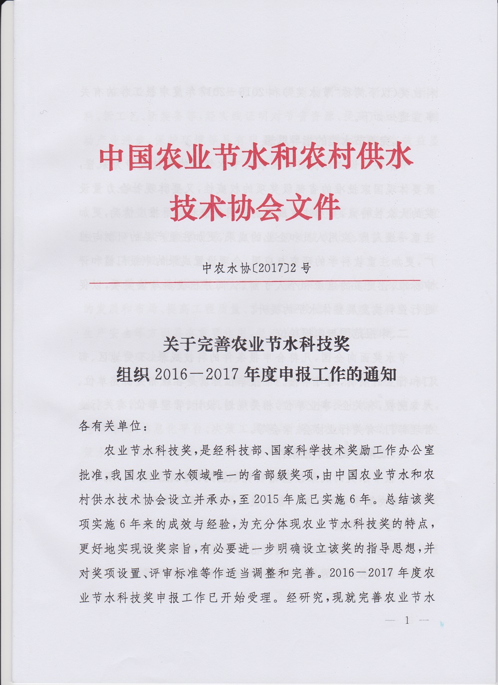 关于组织申报2016-2017年度农业节水科技奖的通知.doc