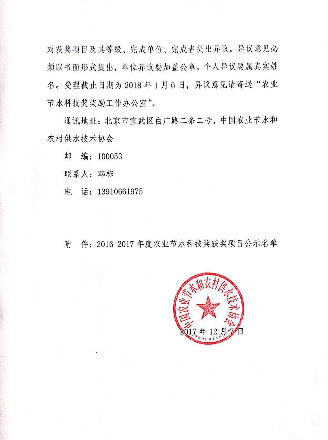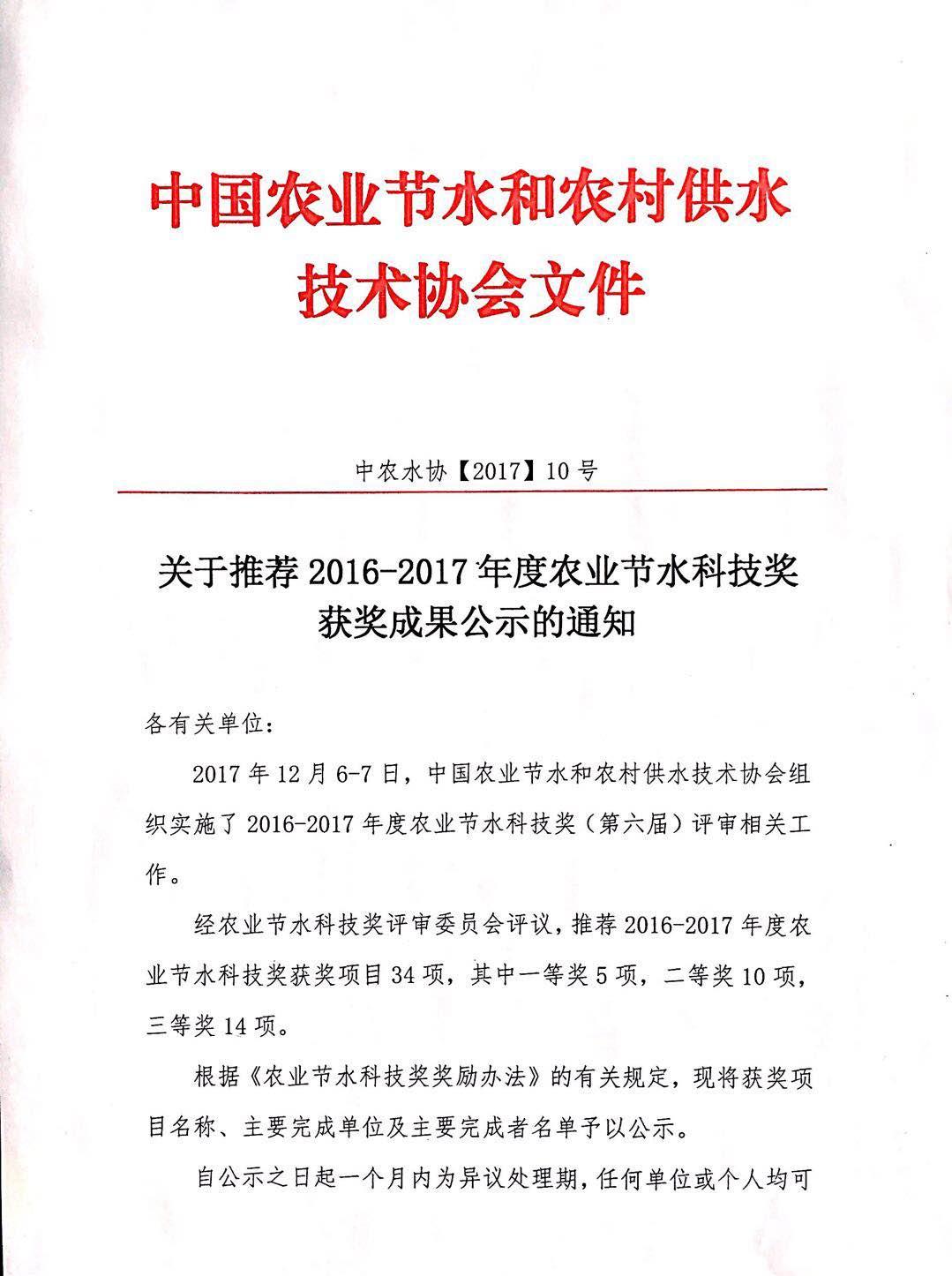 关于完善农业节水科技奖组织2016-2017年度申报工作的通知